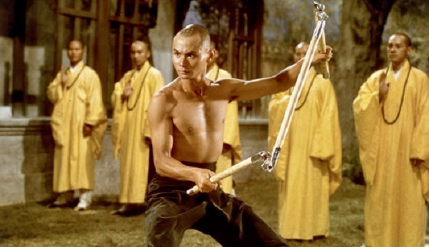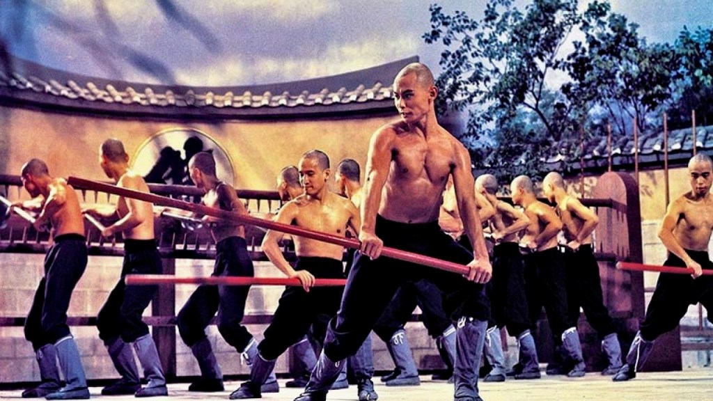 These justly famous training sequences clearly inspired aspects of Quentin Tarantino’s two Kill Bill movies (2003-2004), especially scenes where Uma Thurman (as The Bride) endures physical conditioning under the tutelage of master swordsman Sonny Chiba. Tarantino even cast Gordon Liu in two different roles in the Kill Bill movies, one as the masked bodyguard Johnny Mo and the other as the Kung Fu master Pai Mei.