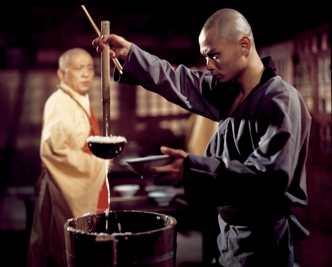 When San Te’s family and numerous resistance members are killed by the Tartars, San Te is forced to flee for his life. He barely escapes Lord Tang and his men but is seriously injured and smuggles himself into a vegetable cart that is being delivered to Shaolin Temple in a nearby village (He hides in a barrel of bok choy!). He recovers from his wounds in the monastery and works for a year performing menial tasks for the monks until he is approved for their form of martial arts training.