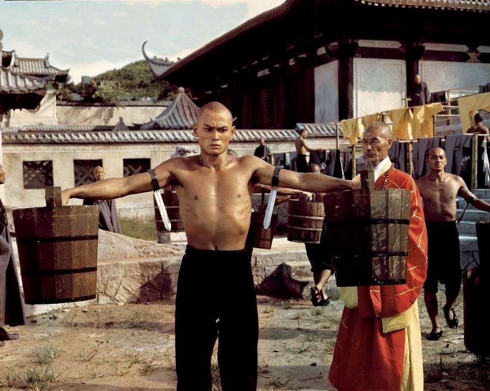 But it is San Te’s progress through the first 35 chambers of training that provides the film’s exotic and otherworldly appeal. Zen-like nuggets such as “A pure body is light, steps stable, stance is firm” guide our hero as he learns to eat congee (rice porridge) from a bowl while balancing his body on a slippery log in a moat. Equally challenging is the eye exercise where San Te must keep his head completely still between two burning incense sticks while relying on his peripheral vision to discern attacks from the side. The sword practice routines look like something out of a choreographed musical number and the head-butting sandbag obstacle course is suitably bizarre.