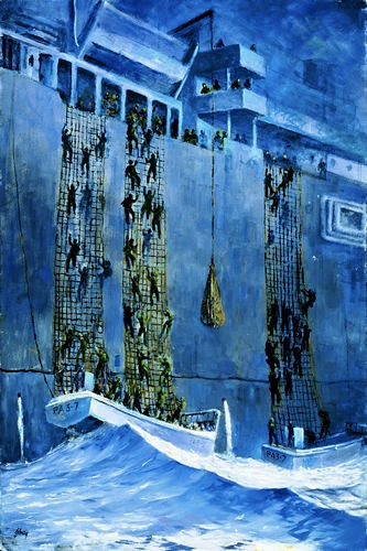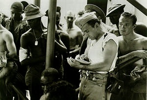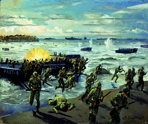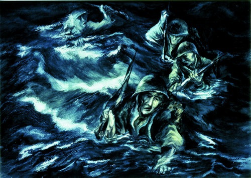 While They Drew Fire: Combat Artists of World War II displays many of the sketches, paintings and watercolors of the seven interviewees, it also includes other famous work from The U. S. Marine Corps Museum, The Navy Art Gallery, and The U.S. Army Center for Military History by such renown artists as Tom Lea, Joseph Hirsch, Thomas Hart Benton and Jacob Lawrence (his famous “Going Home” painting is in the Whitney).