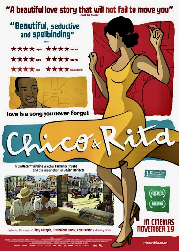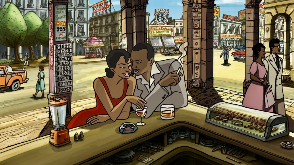 Directed by Fernando Trueba (Twisted Obsession, Belle Epoque) and Javier Mariscal, Chico & Rita (2009) is a love letter to Cuba and its music, rendered in painterly images and vibrant colors which make every frame the most dazzling kind of eye candy. Partially inspired by the music of pianist-composer-bandleader Bebo Valdes, who had been featured previously in Trueba’s Cuban music documentary/concert film Calle 54, the movie paints in broad strokes a 20th century pop culture portrait of Cuba through its title protagonists. Chico is a struggling jazz pianist and Rita is a nightclub singer with dreams of Hollywood fame. While there is nothing particularly original about the boy-meets-girl, boy-loses-girl narrative, Trueba and Mariscal simply use it to serve up some of the greatest Cuban (and American) music of the era and to weave in significant cultural references along the way. There are “guest appearances” by Dizzy Gillespie, Charlie Parker, Nat King Cole (voiced by his brother Freddy Cole), Thelonious Monk and others and every scene is packed with loving attention to detail – A poster of The Orlons’ single “Don’t Hang Up” in Rita’s dressing room, An “Elvis Slept Here” sign above the Eden Roc hotel in Las Vegas, the sound stage set of a MGM musical. The film’s few stabs at historical importance don’t register as strongly and are tossed off too quickly to make deep impressions. The Cuban Revolution flashes by in the background and Rita’s on-stage protest against racial discrimination, while undeniably a major issue for performers of color in the pre-Civil rights era, comes off as more of a historical footnote than a dramatic moment.