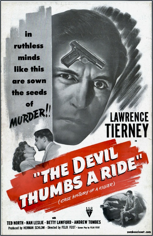 Is there anybody meaner than Lawrence Tierney on the screen? Sure, James Cagney was a bad-ass, shoving a grapefruit into Mae Clarke’s face in The Public Enemy or knocking Virginia Mayo off a chair in White Heat. And Bogart could be equally cold-blooded in films like The Petrified Forest and The Treasure of the Sierra Madre. But Tierney is like a rabid dog in comparison, sparing no one, not even himself, from violent death, and The Devil Thumbs a Ride (1947) is a perfect example of his menacing screen persona.