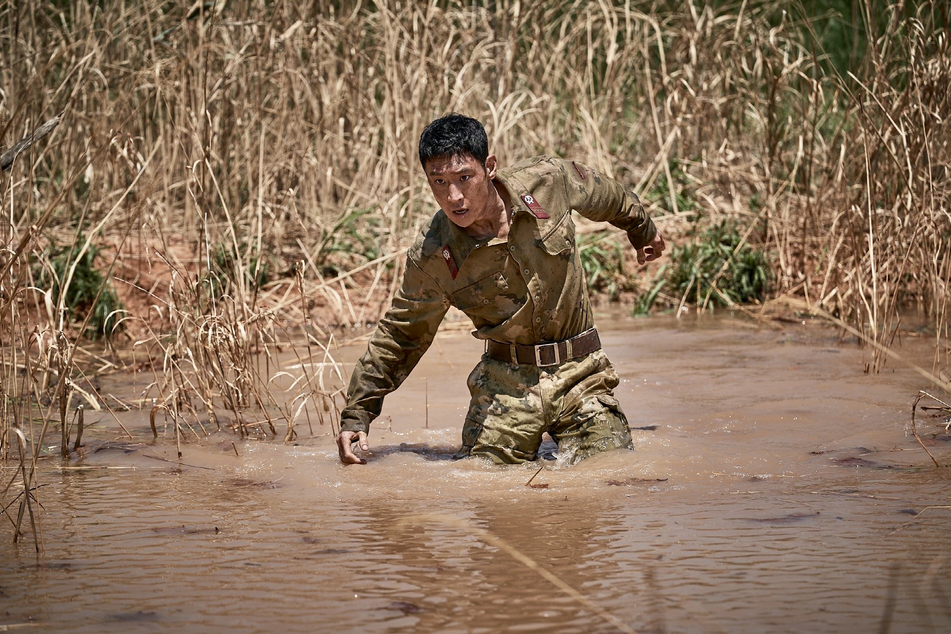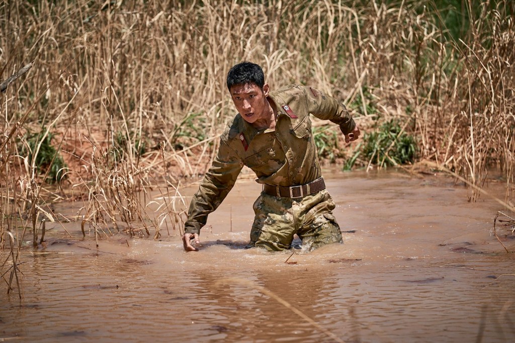 Clocking in at a tightly edited 94 minutes, Escape is an entertaining thrill ride for the most part with Kim using his quick intelligence and physical prowess to avoid numerous traps and tricks orchestrated by Li. The deadly competition between Kim and Li becomes the central focus of the movie and Koo Kyo-hwan portrays Li as a fascinating and complex villain. Although he comes from a privileged background as a classically trained pianist, he also appears to be leading a double life as a married man who may have had a male lover in his past (the scene where Li locks eyes with Seon Woo-min (played by K-pop star Song Kang) at a military celebration suggests something stronger than friendship). Li also has a sadistic sense of humor and a growing obsession with Lim over his desire for freedom. At times his villainy goes over the top with lip smacking, cartoon-like wickedness but he is never dull and consistently entertaining as Kim’s nemesis. In contrast, Lee Je-hoon makes an attractive and charismatic action hero who is physically challenged every step of the way, whether it is dodging bullets, crawling on his belly in mine fields or wading through swamps.