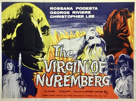 The opening sequence of the Italian film La Vergine di Norimberga (U.S. release title, Horror Castle (1963) could be a primer for Gothic horror films with every cliche of the genre on display. A dark, stormy night. A creepy castle. A frightened woman in a nightgown exploring the darkened corridors by candlelight. Where it departs from the predictable formula is in the dramatic payoff – the gruesome discovery of a mutilated woman locked inside an iron maiden, “The Virgin of Nuremberg” (the original Italian title of the film).