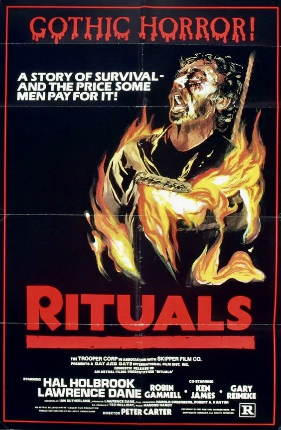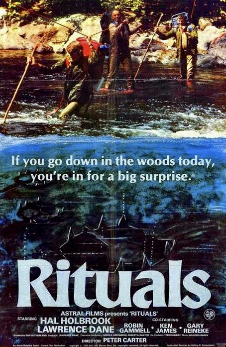 Posters bearing Rituals as the title were split between positioning the movie as a survivalist thriller or a horror genre entry. An example of the former shows a grimacing Hal Holbrook pointing a gun with the tag line, “In A World Turned Suddenly Savage, The Answers Have Become – Brutally Simple!” Among the horror promotions is a poster version showing campers fording a river while a skull-faced entity looks down on them from above. The most ambiguous poster of all borrows a line from the 1907 Americana folk song The Teddy Bears’ Picnic: “If you go down in the woods today, you’re in for a big surprise.”
