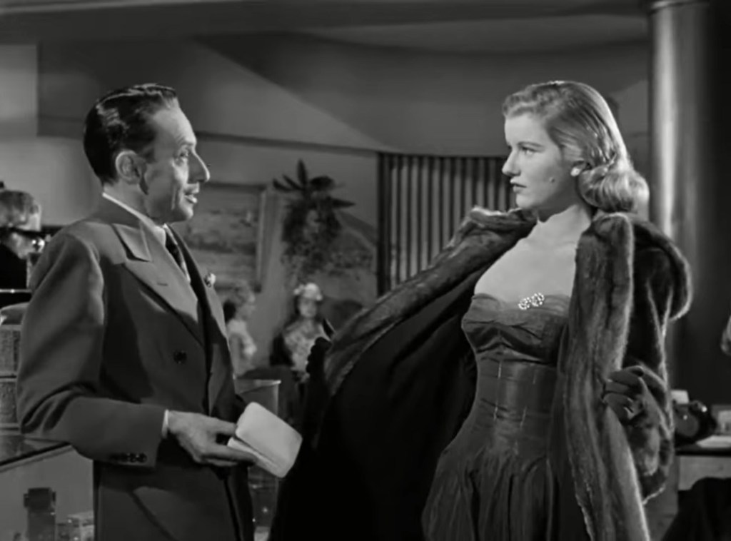 By the time Ophuls and Laurents collaborated on it, Block’s story had been severely altered with numerous characters and subplots dropped from the original narrative. In the final version, Maud becomes Leonora, a car hop waitress with a gold-digging roommate named Maxine. Determined to get a better job, Leonora budgets her meager salary so she can attend Dorothy Dale’s charm school. Upon graduating, she manages to get a better paid job modeling fur coats at a department store. One day, a suspicious man with an accent named Franzi Kartos invites her to a private party on a yacht owned by business tycoon Smith Ohlrig. She doesn’t have any desire to go until Maxine convinces her not to ignore what could be a golden opportunity.