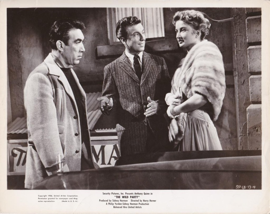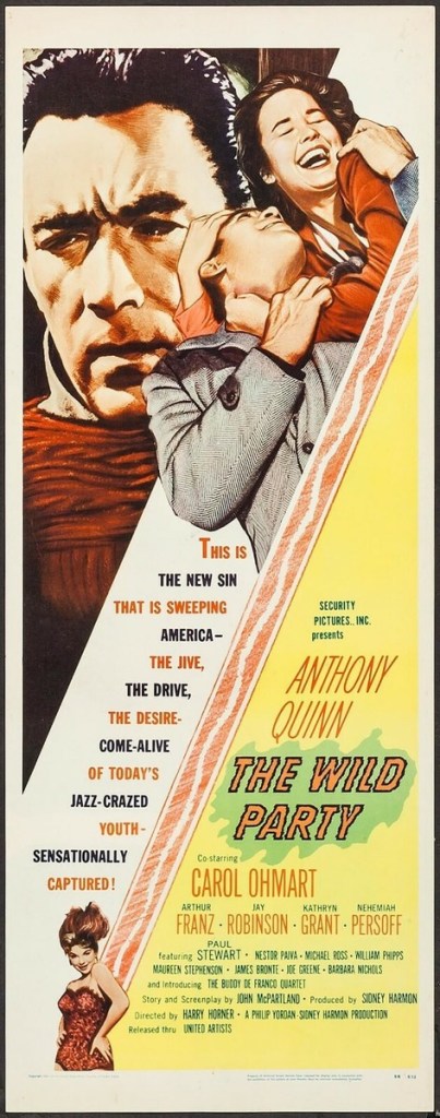 Among the numerous Hollywood films that attempted to explore the subculture of the emerging beatnik and bohemian scene of the late fifties, none is odder or more blatantly miscast than The Wild Party (1956) which casts Anthony Quinn as Tom Kupfen, a former star football player turned full time deadbeat, hanging out at basement jazz clubs and dive bars, looking for action. He’s joined by a motley crew of hipster accomplices that includes Kicks (Nehemiah Persoff), a jazz pianist of some talent, Honey (Kathryn Grant), a spaced-out former girlfriend, and Gage (Jay Robinson), a switchblade-toting psychopath.