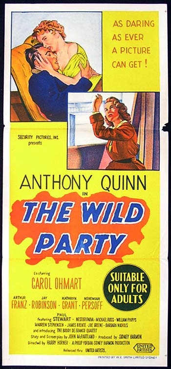 This 1956 melodrama is easily the most obscure and will probably remain that way for obvious reasons. Released theatrically by United States, this independent production from Security Pictures has never been released on DVD or Blu-ray in the U.S. or has it? I see that there is a Spanish import of The Wild Party in English available through online sellers if you own an all-region DVD player (the only way to view it). You may also be able to stream it on various media platforms like Prime.