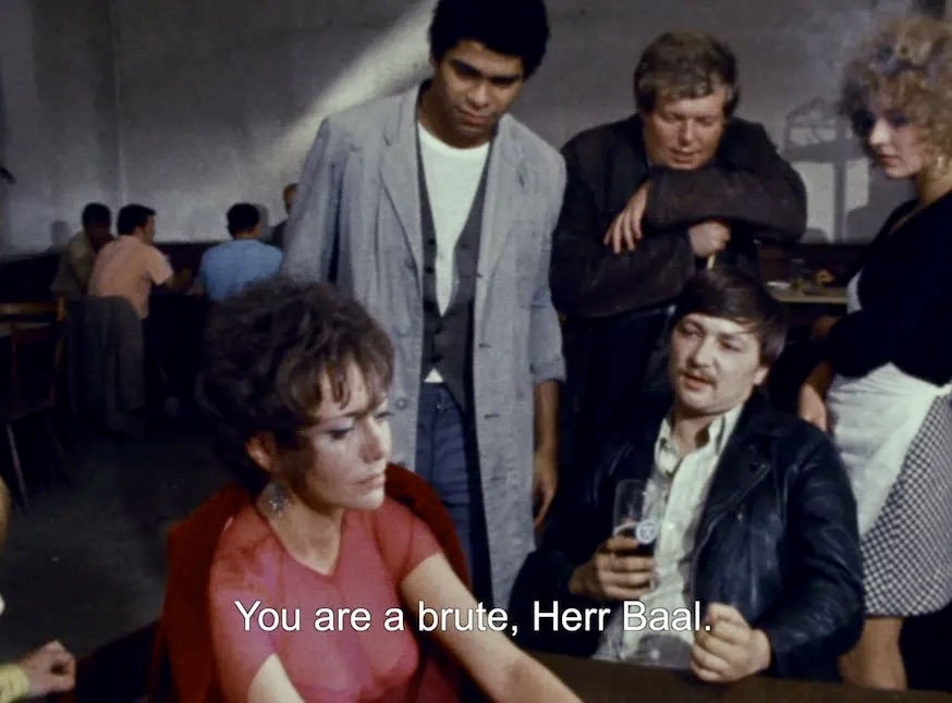 It is also interesting to note that Schlondorff hired several actors who had worked with Fassbinder for this production. In minor roles, you can spot Hannah Schygulla as a barmaid, Irm Hermann as the outraged mother of a young girl seduced by Baal, Harry Baer as a dinner guest and Gunther Kaufmann as a tavern customer. Kaufmann and Fassbinder would become lovers during the making of this film and the actor would appear in such subsequent Fassbinder productions as Gods of the Plague (1970), The Niklashausen Journey (1970), Rio das Mortes (1971), Pioneers in Ingolstadt (1971) and would play the lead in Whity (1971).