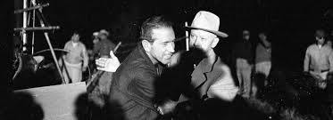 One of the all-time great drive-in movies and probably the best film you’ll ever see about Tennessee moonshiners and their midnight runners, Thunder Road (1958) is an impressive achievement for Robert Mitchum. He wrote the original story, produced the film, and starred in it. He also wrote “Whippoorwill,” (It is performed in the film by Keely Smith, an ex-wife and former singer for Louis Prima and his band), sang the title song “The Ballad of Thunder Road” on the 45 hit single (but not the film – Randy Sparks sings it on the soundtrack) and chose his real-life son Jim to play his brother in the film! One thing Robert Mitchum didn’t do, however, was drive his car into those killer power lines at the film’s electrifying climax. That job fell to stunt driver Carey Loftin.