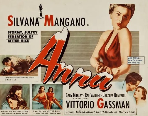 Anna is not currently available on any format in the U.S. and is unlikely to become a future release for the Criterion Collection or other prestige distributors of international cinema on Blu-ray due to the film’s lack of critical acclaim or artistic merit. But it is certainly a cultural milestone of some kind and historically important for its main players but also Lattuada’s film crew which includes music composer Nino Rota and cinematographer Otello Martelli, who filmed landmark movies for Roberto Rossellini [Paisan (1946), Stromboli (1950)] and Federico Fellini [I Vitelloni (1953), La Strada (1954), La Dolce Vita (1960)]. For those who are interested, a subpar but viewable copy of Anna (without English subtitles) can be streamed on Youtube.