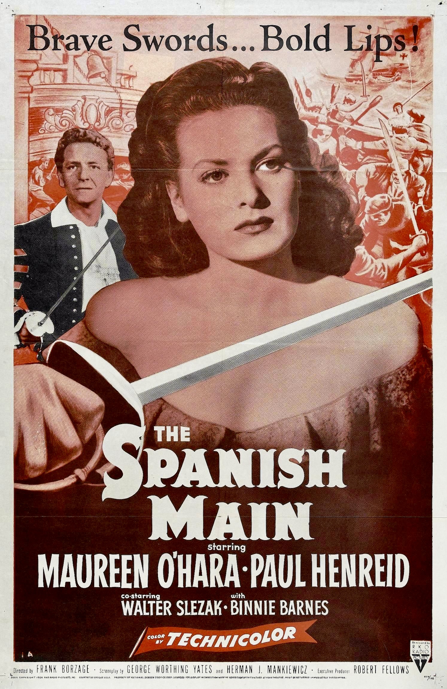 For Maureen O’Hara, The Spanish Main was, according to her autobiography, “good swashbuckler fare, pairing me with Paul Henreid, the Austrian actor best known for his role as Victor Laszlo in Casablanca [1942]. Some in Hollywood called him “Crackerbutt Hemorrhoid” because he had no behind at all. Truthfully, he was too charming and not tough enough for the role in our film. Frank Borzage directed the picture and it was shot in Technicolor by cinematographer George Barnes. With a camera, George could make you look like milk and honey, sugar and cream.”