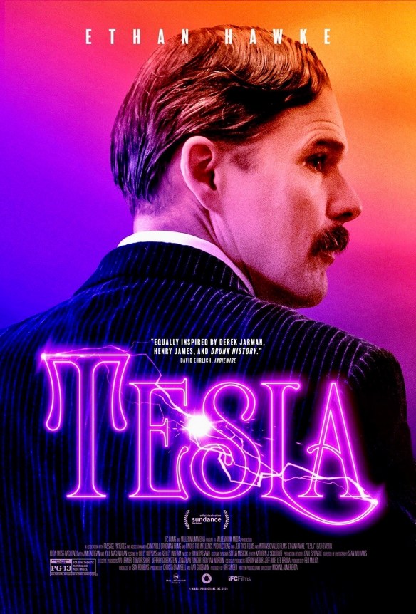 Who was Nikola Tesla? Some people know him as the scientific genius who created the alternating current (AC) electrical system which became the industry standard instead of Thomas Edison’s direct current (DC) electrical system. Tesla is also credited with developing the first X-ray films known as shadowgraphs, inventing the Tesla coil which became the basis of modern radio technology, designing the first neon sign and holding the patents for more than 250 inventions which have improved the quality of human life. Such brilliance comes with a price and the Croatian-born immigrant was also an eccentric with no talent for profitable self-promotion or successful business ventures which often affected his career adversely. Sounds like a fascinating subject for a film, right? Director/screenwriter Michael Almereyda thought so too and his 2020 movie Tesla featuring Ethan Hawke in the title role, is currently in release but be forewarned, this is NOT a conventional biopic by any stretch of the imagination. Continue reading