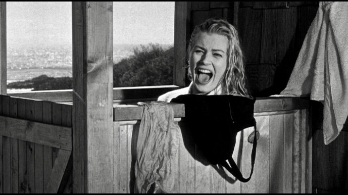 Anita Ekberg screams as a crazed maniac (offscreen) approaches her with a knife as she showers outside in Screaming Mimi (1958), directed by Gerd Oswald.