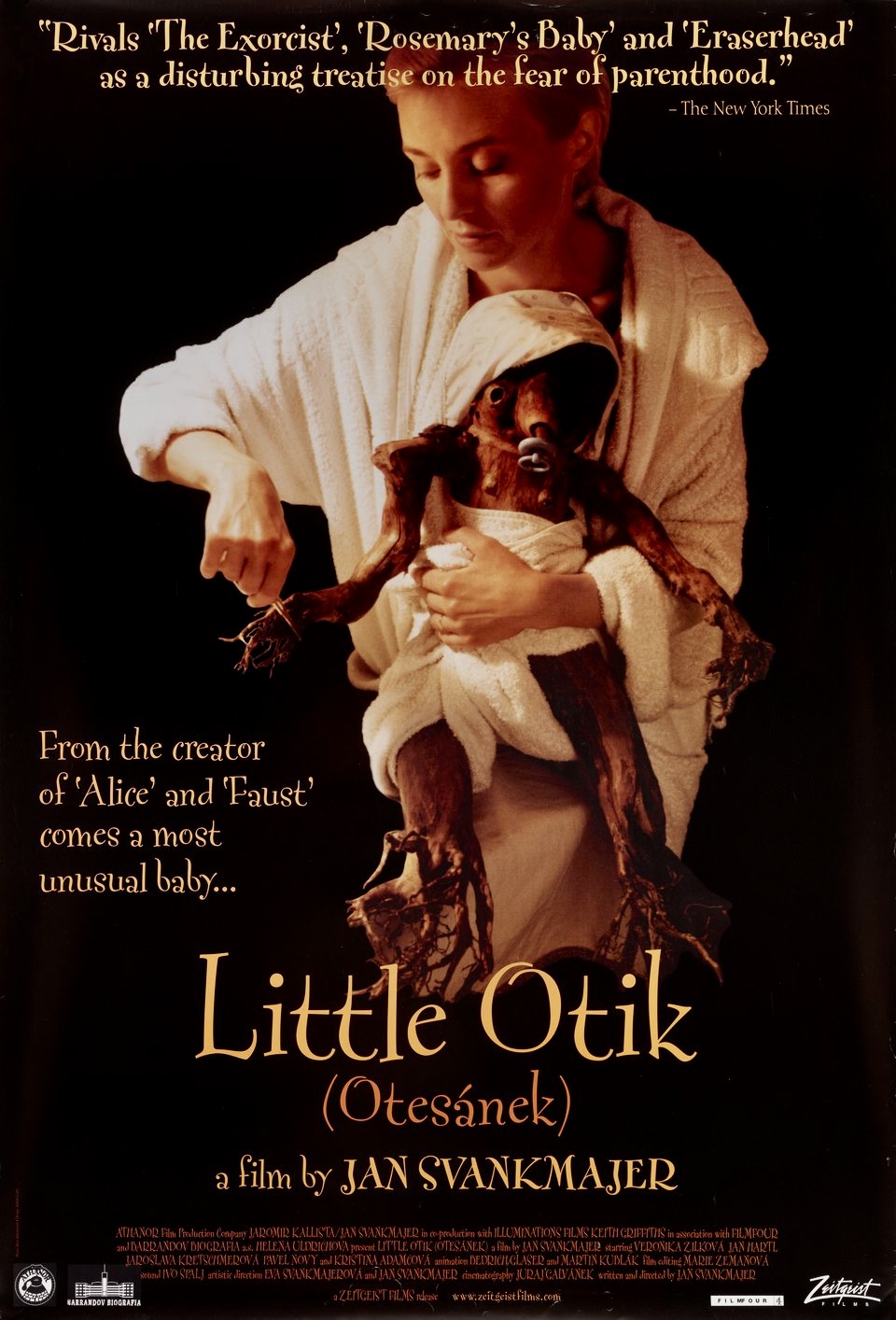 “Be careful what you wish for” is one of those popular expressions that offers cautionary advice for those who want something too desperately. And it has been illustrated repeatedly in literature and movies from timeless folk tales like Faust and The Golem to more recent efforts like Little Otik (2000), Czech filmmaker Jan Svankmajer’s take on Otesanek, a 19th century fairy tale by Karel Jaromir Erben. Svankmajer updates the tale about a childless couple and their substitute baby to contemporary times but also manages to weave in some of his favorite obsessions and thematic concerns (food, cannibalism, human fears) into a darkly funny but nightmarish portrait of parenthood and child rearing. Despite its stature as a fable, Little Otik is certainly not for children and probably not the best viewing option for expectant mothers either.