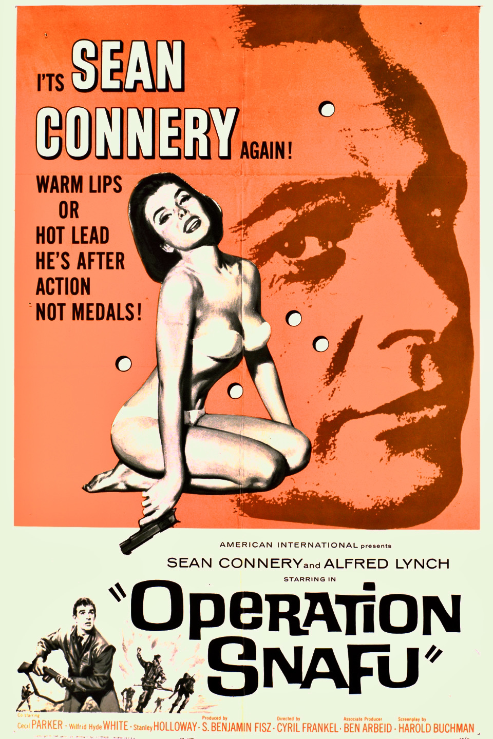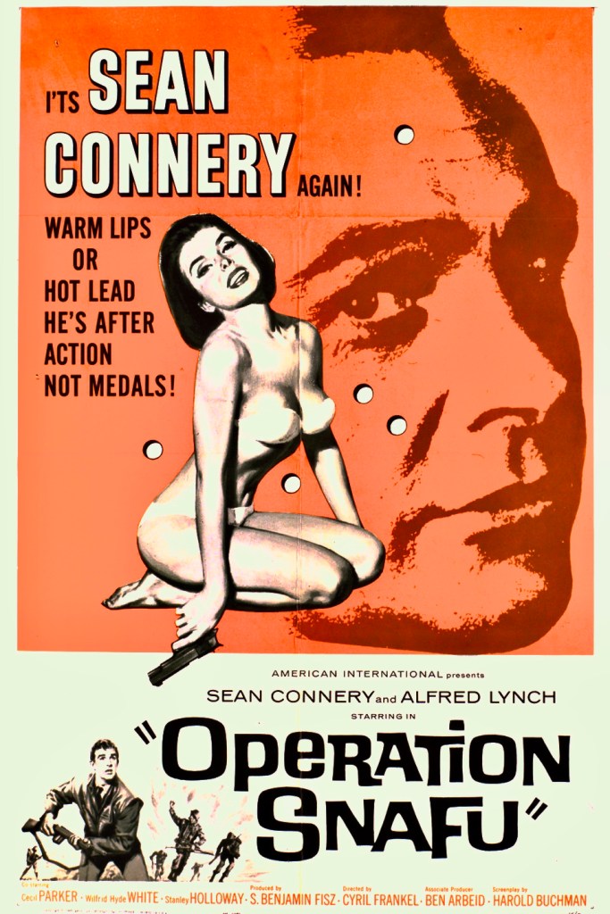 What’s your favorite Sean Connery role before he became famous as James Bond. This question might stump the average movie-goer but film buffs would probably choose one of his menacing villain roles in either Hell Drivers (1957) or Tarzan’s Greatest Adventure (1959) or possibly his dashing romantic hero opposite Janet Munro in Walt Disney’s Darby O’Gill and the Little People (1959), where he actually gets to sing. The latter is easily my favorite with the Irish mythology of leprechauns, pookas and banshees giving it the edge but there is something quite appealing about Connery trying his hand at comedy in the lesser-known British B-movie Operation Snafu (1961), which was released in the U.K. as On the Fiddle (It was also known as Operation War Head).